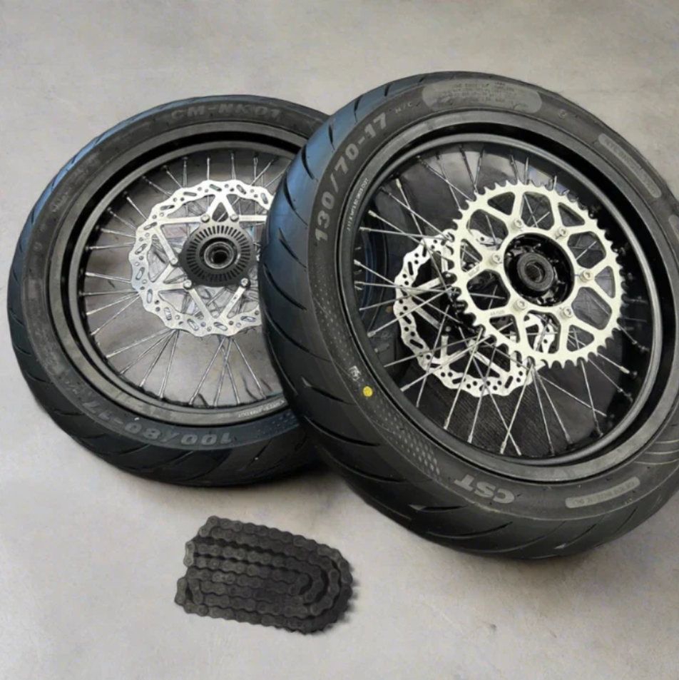 Transform your Sur-Ron Ultra Bee into a sharp-handling, street-focused supermoto with this 17” genuine Sur-Ron supermoto wheel kit. Built specifically for the Ultra Bee platform, this kit lets you swap from off-road to supermoto quickly and confidently—without the high cost of aftermarket alternatives.